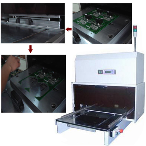 把分板沖模安裝在氣動(dòng)沖床PCB曲線式分板機(jī),CWPE上,把要分切的曲線PCB拼板放于下模對(duì)應(yīng)位置,按啟動(dòng)開(kāi)關(guān)可進(jìn)行一次性分板,工作中下模采用自動(dòng)推拉,減輕勞動(dòng)強(qiáng)度,更提高安全度,同時(shí)取放成品十分方便。